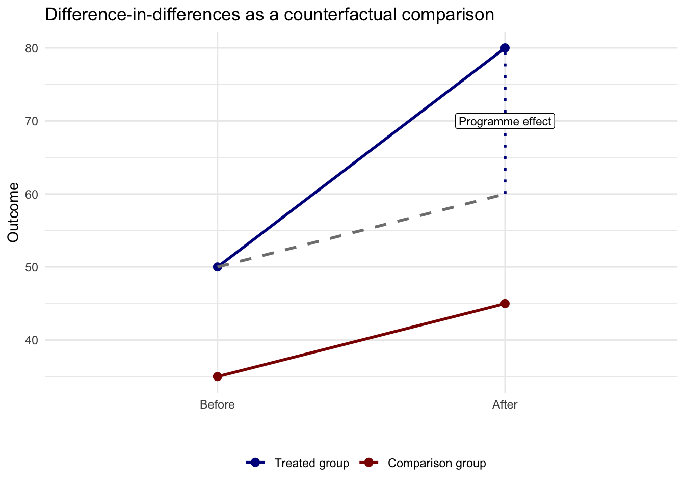 We can now compare the average outcome before and after the policy change for both areas. This plot is the visual version of the DiD table. It shows the before-after change in London and compares it with the before-after change in Edinburgh.