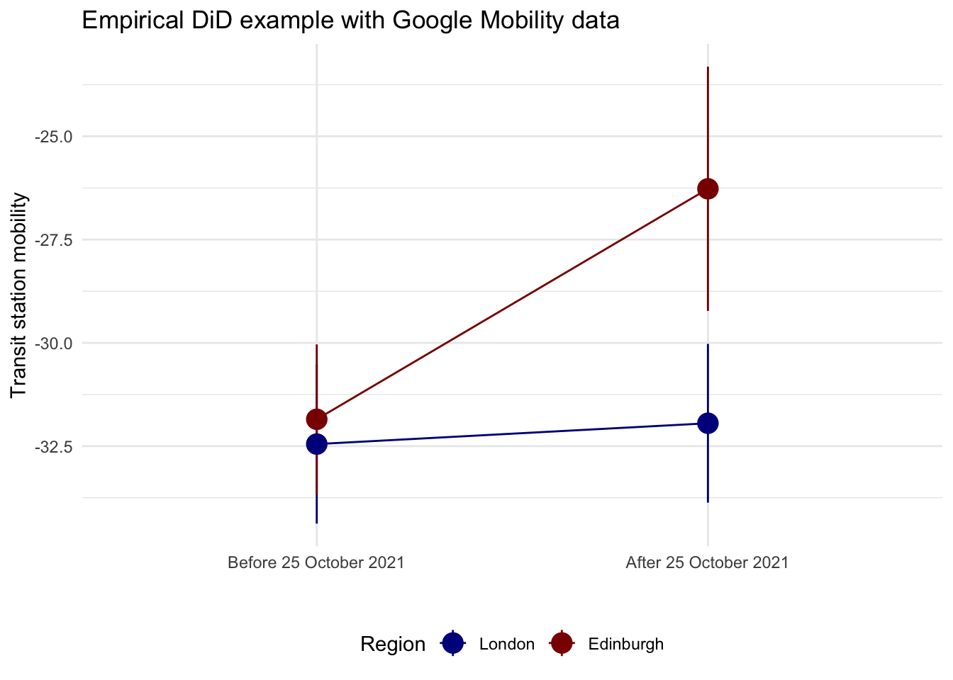 In this empirical example, the DiD estimate is the extra post-treatment change in London relative to the post-treatment change in Edinburgh. With these data, the estimate is about -5.08, meaning that transit station mobility in London fell by around 5 percentage points more than we would have expected from the change observed in Edinburgh.